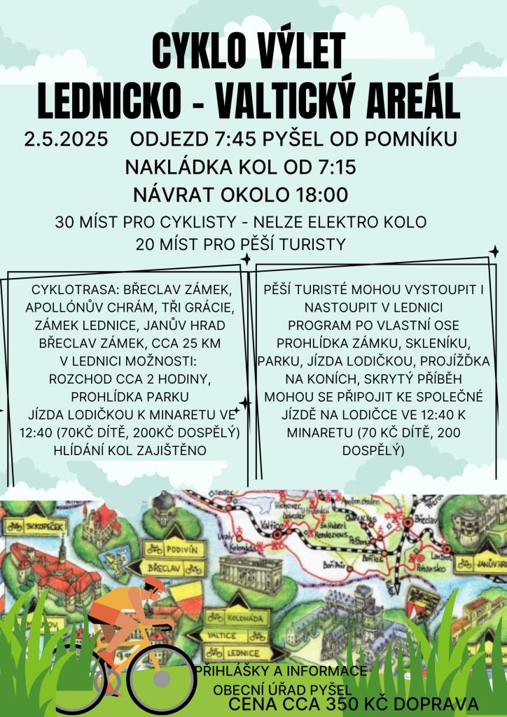 Pokud ještě nemáte plány na pátek, můžete vyrazit se základní školou Pyšel do Lednicko-valtického areálu na kola nebo i pěšky. Ještě je pár volných míst. Neváhejte s přihláškou na obecním úřadě Pyšel.
